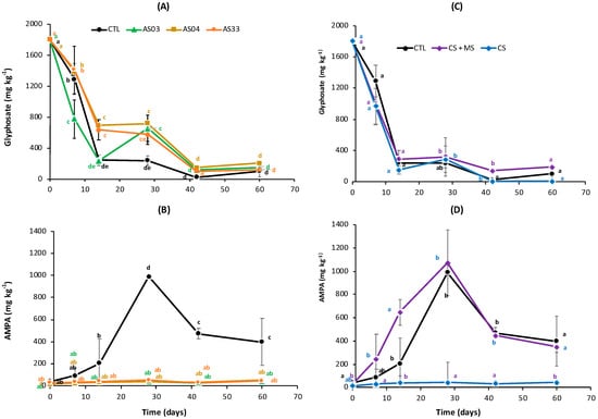 The dynamic between glyphosate and AMPA concentration in soil for 60 days. (A,B) show control (CTL), AS03 (E. indicum), AS04 (K. sediminis), and AS33 (R. rhodochrous). (C,D) show CTL, compared with CS (a consortium of AS03, AS04, and AS33) and CS + MS (consortium plus soil microorganisms). Different lowercase letters each time indicate significant differences for the Tukey test (p < 0.05) and n = 4.