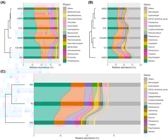 Relative abundance (%) of soil bacterial community at different taxonomic levels and conditions. (A) shows the relative abundance at the phylum level in response to treatments, including sterilized soil inoculated with isolates (AS03, AS04, AS33), sterilized soil inoculated with a microbial consortium (CS), sterilized soil inoculated with a consortium and native microbiota (CS + MS), and the control (CTL). (B) presents the relative abundance at the genus level under the same treatments as in (A). (C) illustrates the relative abundance at the genus level across three time points: T0 (before glyphosate application), T42 (42 days after application), and T60 (60 days after application). Hierarchical clustering dendrograms are included in each figure to demonstrate the similarities in community composition among treatments (A,B) or time points (C).