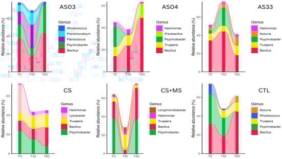 Other genera, such as Psychrobacter and Truepera, showed varied abundances across treatments and time points, indicating differential responses to glyphosate treatment. For example, the Planococcus genus in the AS03 treatment increased significantly at T42, whereas Psychrobacter in the CTL treatment decreased markedly between T42 and T60.