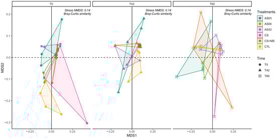 NMDS plots in a “facet grid” format depict the dynamics of soil bacterial composition at three time points: T0, T42, and T60. These plots assess the impact of treatments AS03, AS04, AS33, CS, CS + MS, and control (CTL), highlighting variations in microbial composition over time and across treatments, analyzed using the weighted UNIFRAC metric. Stress NMDS = 0.14.