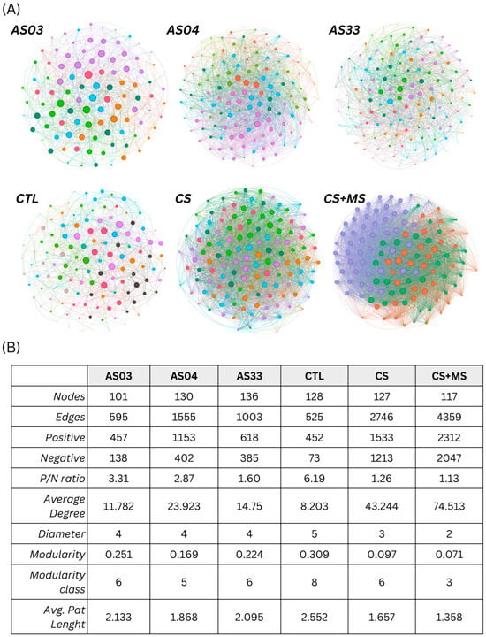 Network analysis of soil bacterial communities for different microbial treatments across time points (T0, T42, and T60 days after glyphosate application). (A) displays network graphs for bacterial isolates (AS03, AS04, AS33), a control group (CTL), and microbial consortia (CS, CS + MS). Nodes represent bacterial genera, color-coded by modularity class, with edges indicating significant co-occurrence or co-exclusion interactions. (B) details network metrics: number of nodes (total genera), number of edges (interactions), positive and negative connections, positive/negative (P/N) ratio (balance of interactions), average degree (average connections per node), network diameter (most significant distance between nodes), modularity (network division into modules), and average path length (average number of steps along the shortest paths for all possible pairs of nodes). These metrics reveal the structural complexity and interaction dynamics within each treatment.