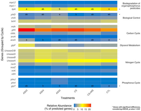 Figure 2B (lower plot) indicates that Bacillus was dominant in CTL treatments and isolates, whereas its abundance was significantly reduced in consortium treatments (CS and CS + MS). In addition, AS03 treatment increased the genus Planococcus and resulted in a notable reduction in Truepera. Conversely, treatments involving individual isolates and the unsterilized control showed a more diverse microbial community than the distinct profile of the consortium treatments, which showed significant increases in Psichrobacter and Lyzobacter. This behavior suggests that interactions among multiple isolates and the native soil microbiota foster a conducive environment for microorganisms that effectively degrade glyphosate.