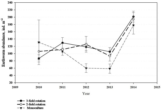 Earthworm population dynamics under different crop rotation systems—abundance (ind. m−2) (2010–2014). Points and bars represent means ± standard error (n = 36 in 2011–2014; n = 24 in 2010). Rotation compositions: three-field (spring rape–spring barley–winter wheat), two-field (winter wheat–winter rape), and monoculture (continuous winter wheat). Samples were collected annually at post-harvest from 25 × 25 cm soil monoliths at 0–25 cm depth.