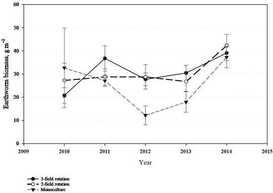 Earthworm population dynamics under different crop rotation systems—biomass (g. m−2) (2010–2014). Points and bars represent means ± standard error (n = 36 in 2011–2014; n = 24 in 2010). Rotation compositions: three-field (spring rape–spring barley–winter wheat), two-field (winter wheat–winter rape), and monoculture (continuous winter wheat). Samples were collected annually at post-harvest from 25 × 25 cm soil monoliths at 0–25 cm depth.