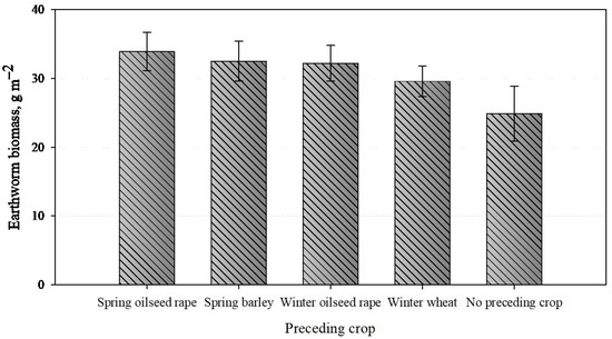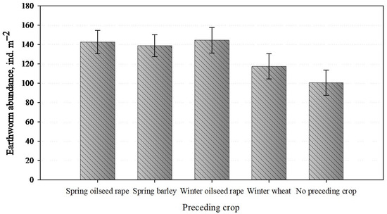 The variety of crop rotation significantly influences earthworm populations. Research demonstrates that earthworm populations decline consistently with the decrease in crop rotation systems—from four-field to three-field and two-field rotations, resulting in average counts of 64.3, 62.1, and 57.7 individuals per m2, respectively [28]. The choice of the preceding crop significantly affects earthworm population density. The highest earthworm densities were seen after sugar beet (99 individuals m−2), followed by barley and winter wheat (56 and 50 individuals m−2, respectively), with the lowest densities recorded after peas (35 individuals m−2) [29]. Another study conducted in Lithuania demonstrated that after increasing the cereal proportion in crop rotation from 50% to 100%, a decline of 33% in earthworm population density was observed [30].