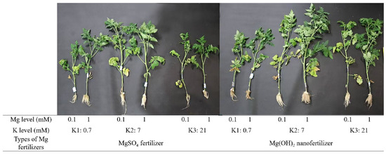 The roots of the selected seedlings were carefully washed with deionized water and dried on filter paper. Plants of similar weight were treated with nutrient solutions containing different K:Mg ratios and Mg morphologies. Four plants were transplanted into each 3 L hydroponic container and supplied with full-strength modified Hoagland nutrient solution for optimal growth. The nutrient solution was prepared by dissolving analytical reagents in deionized water according to the modified Hoagland formula: Ca(NO3)2·4H2O: 3.4 mM; NH4NO3: 1.5 mM; NH4H2PO4: 1.5 mM; ethylenediaminetetraacetic acid·NaFe·3H2O: 53 µM; H3BO3: 46 µM; MnSO4·H2O: 13 µM; ZnSO4·7H2O: 0.76 µM; CuSO4·5H2O: 0.016 µM; (NH4)6Mo7O24·4H2O: 20 µM. The pH of the nutrient solution was adjusted to 6.5 using dilute H2SO4 or dilute KOH. The levels of K and Mg were adjusted using K2SO4 and MgSO4 or Mg(OH)2 while maintaining the other elements in the original formula. In the hydroponic experiment involving the application of nano-Mg to roots, suspensions of Mg(OH)2 NPs were prepared in 50 mL of deionized water, containing 174.9 mg and 17.49 mg, respectively. Prior to application, the Mg(OH)2 suspensions underwent sonication using an ultrasonic homogenizer operating at approximately 40 kHz and 150 Watts for 20 min to ensure the production of a homogeneous aqueous solution. Subsequently, freshly prepared exposure test solutions of Mg(OH)2 were applied to the plant roots, which were placed in a wide-mouth plastic container containing Mg-deficient Hoagland medium (3 L) and stirred. As a result, the hydroponic system was filled with Mg(OH)2 NPs suspended in deionized water at concentrations of 58.3 mg L−1 or 5.83 mg L−1. The hydroponic culture was equipped with an aquarium aerator to provide oxygen to the roots and later to maintain the NPs in suspension. The nutrient solution was renewed weekly during the early stages of plant growth and biweekly in later growth stages. Throughout the 28-day experimental period, plants were closely monitored for significant differences among treatments and the onset of nutrient deficiency symptoms (Figure 2). Further analyses were conducted to assess the impacts of varying K:Mg ratios and Mg forms on seedling growth and physiology, including biomass, chlorophyll content, K and Mg concentrations, as well as related indicators calculated to assess K–Mg antagonism.