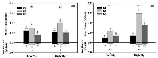 Effects of different potassium (K) and magnesium (Mg) rates (K1: 0.7 mM, K2: 7 mM, K3: 21 mM, low Mg: 0.1 mM, high Mg: 1 mM) on the shoot and root biomass of tomato seedlings under MgSO4 (a) and nano-Mg applications (b), respectively. Values are the average + SE of four replicates. Means with the same letters are not significantly different at p < 0.05 among different K rates, according to Fisher’s least significant difference (LSD) test. ns indicate not significantly different, *, ** and *** indicate significant differences at p < 0.05, p < 0.01 and p < 0.001, respectively, between different Mg rates.