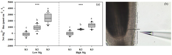 (a) Net Mg2+ fluxes on tomato root (elongation zone) surfaces under different K and Mg supply rates (K1: 0.7 mM, K2: 7 mM, K3: 21 mM, Low Mg: 0.1 mM, High Mg: 1 mM) (under MgSO4 application). Positive and negative values indicate efflux and influx, respectively. (b) Image of the root elongation zone. The data represent values with 95% bootstrap confidence intervals, and the solid line passing through the box indicates the median. Means with the same letters are not significantly different at p < 0.05 among different K rates according to Fisher’s least significant difference (LSD) test. *** indicates significant differences at p < 0.001 between different Mg rates. Schematic diagram of tomato root system under noninvasive microtest micrometer (b).