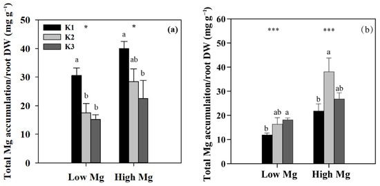 Total (shoot + root) accumulation of Mg per unit DWR in tomato seedlings under MgSO4 (a) and nano-Mg (b) applications, respectively, in response to various K and Mg supply rates (K1: 0.7 mM, K2: 7 mM, K3: 21 mM, Low Mg: 0.1 mM, High Mg: 1 mM). Values are the average + SE of four replicates. Means with the same letters are not significantly different at p < 0.05 among different K rates, according to Fisher’s least significant difference (LSD) test. * and *** indicate significant differences at p < 0.05 and p < 0.001 between different Mg rates.