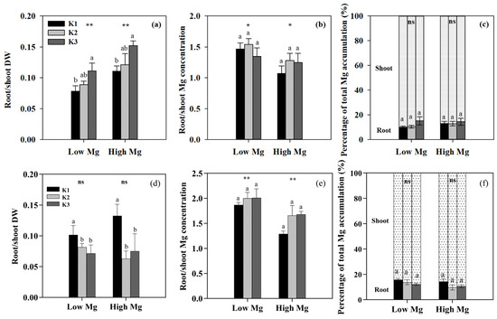 Effects of K and Mg supply rates (K1: 0.7 mM, K2: 7 mM, K3: 21 mM, Low Mg: 0.1 mM, High Mg: 1 mM) on the root-to-shoot ratios of (a,d) dry weight (DW), (b,e) Mg concentration, and (c,f) root and shoot Mg accumulation as percentages of total (root + shoot) Mg accumulation in tomato seedlings under MgSO4 (a–c) and nano-Mg (d–f) applications, respectively. Values are the average + SE of four replicates. Means with the same letters are not significantly different at p < 0.05 among different K rates according to Fisher’s least significant difference (LSD) test. ns indicates not significantly different, * and ** indicate significant differences at p < 0.05 and p < 0.01 between different Mg rates.