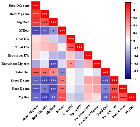 Pearson correlation analysis of indicators related to K–Mg antagonism (under MgSO4 application). Note that Mg or K/Root indicates total Mg or K accumulation (shoot + root) per unit root dry weight, respectively. Chlorophyll concentrations were measured in leaves. Mg fluxes were measured at the surface of the root elongation zone. Chol, chlorophyll; conc, concentration. The red and blue colors correspond to positive and negative correlations between the measured traits, respectively. The color is related to the strength of correlation. *, **, and *** indicate significant differences at p < 0.05, p < 0.01, and p < 0.001.