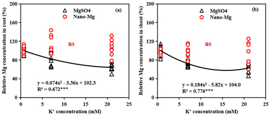 Relationships between K+ concentrations and relative Mg concentrations in root (a) and shoot (b) of tomato under different Mg source (MgSO4 and nano-Mg). Relative Mg concentrations in shoot (root) were calculated by shoot (root) Mg concentration in higher K+ treatments (7 and 21 mM) divided by shoot (root) Mg concentration in low K+ treatment (0.7 mM). ns, not significantly different. *** indicates significant differences at p < 0.001.