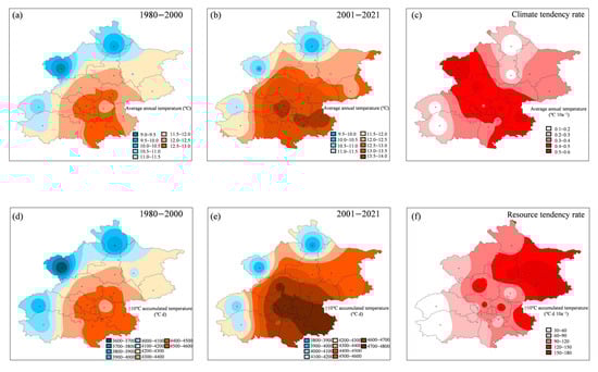 The spatial distribution of average annual temperature, annual accumulated temperature and climate tendency rate in Beijing. (a) The mean value of average annual temperature during 1980~2000; (b) the mean value of average annual temperature during 2001~2021; (c) the climate tendency rate of average annual temperature during 1980~2021; (d) the mean value of accumulated temperature during 1980~2000; (e) the mean value of accumulated temperature during 2001~2021; and (f) the resource tendency rate of accumulated temperature during 1980~2021.
