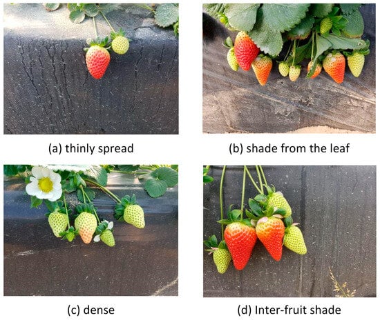 Ridge cultivation is the primary planting method for strawberries, optimizing land use and light exposure but introducing new challenges for visual recognition. In ridge environments, strawberries exhibit varying ripeness levels, are distributed at different positions, and are often surrounded by cluttered backgrounds [3,4], dynamic lighting conditions [5], and occlusions [6], which increases the difficulty of visual recognition. To overcome these challenges, strawberry harvesting robots must accurately identify strawberries at different ripeness levels (unripe, partially ripe, fully ripe) and harvest them in complex environments. For unripe strawberries, fruit thinning can reduce nutrient competition among plants, promoting the growth and quality of the remaining fruits. At the same time, partially ripe strawberries are suitable for long-distance transportation or extended shelf life, while fully ripe strawberries offer the best taste and quality, improving overall production efficiency [7].