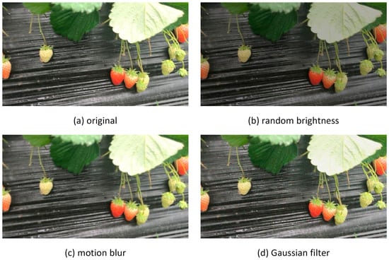 After data cleaning and the removal of images without relevant instances, a total of 2252 high-quality images were obtained. To improve the model’s robustness, a portion of the dataset was randomly selected for data augmentation. This study proposed a data augmentation method tailored for agricultural harvesting robots. First, random brightness adjustments were applied to simulate varying lighting conditions, accommodating the robot’s operational needs in diverse environments. Second, motion blur was introduced to simulate image blurring caused by slight camera or object movements during robotic operation. Additionally, Gaussian noise was added to emulate random noise caused by electronic interference during real-world image acquisition. These augmentation techniques expanded the dataset to 3000 images, which were saved in JPG format, as shown in Figure 2.