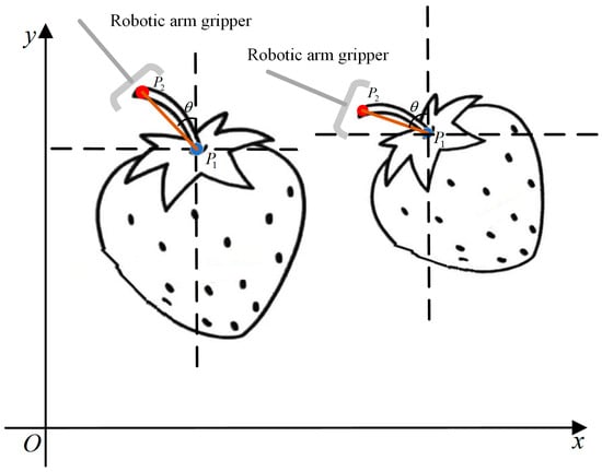 To address the spatial characteristics of strawberries, as shown in Figure 3, this study selects the calyx (P1) and the harvesting point (P2) as the keypoints. The line connecting these two points aids in determining the strawberry’s posture, allowing the robotic arm’s gripper to adjust its grasping angle and thereby minimize the risk of bruising the fruit.
