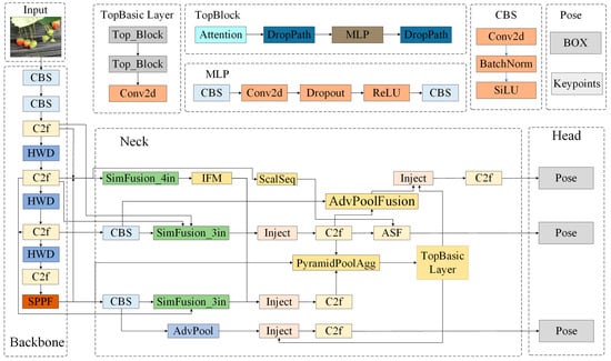 Strawberries typically exhibit small target features with shape and color variations in natural environments, which increases the difficulty of their detection. Moreover, changes in lighting conditions and potential occlusions can affect the model’s accuracy in locating strawberries. This is especially challenging in keypoint detection for the harvesting location, where strawberry maturity and picking points are often difficult to capture and pinpoint. To address these issues, this paper proposes three improvements to the YOLOv8-Pose model, As shown in Figure 4: (1) the use of the Gold-YOLO neck structure to optimize the neck design of YOLOv8-Pose, enhancing the model’s global feature extraction capability; (2) the application of HWD (Haar Wavelet Downsampling) to improve the backbone network, further enhancing the model’s feature understanding and extraction ability in complex environments; and (3) the adoption of LAMP pruning technology to improve the model’s inference efficiency and reduce computational costs.