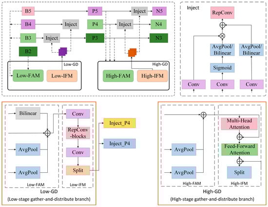 As illustrated in Figure 6, the GD mechanism comprises three key modules: the Feature Alignment Module (FAM), the Information Fusion Module (IFM), and the Information Injection Module (Inject). FAM collects and aligns multi-scale features from different layers of the backbone network, ensuring consistency in feature dimensions for seamless fusion. IFM employs convolution and self-attention mechanisms to integrate global features across scales. The Inject module subsequently infuses the fused information into features at various levels, enhancing the model’s capability for multi-scale object detection.