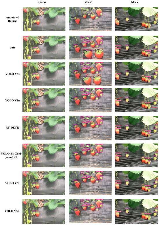 For subsequent experimental analysis, the dataset was divided into training, validation, and testing subsets in a 7:1:2 ratio. In this study, strawberry ripeness was categorized based on fruit color: “unripe” strawberries were green or white, “partially ripe” strawberries had partial red or pink coloration, and “fully ripe” strawberries were uniformly red.