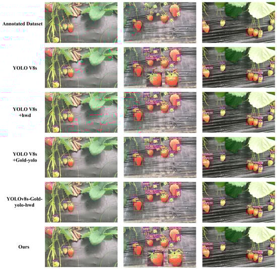 To evaluate the contributions and effectiveness of three strategies—Gold-YOLO neck improvements, HWD wavelet downsampling modules, and model pruning—towards enhancing model performance, these techniques were incrementally integrated into the baseline model. The ablation experiment results are presented in Table 4, Figure 9 shows the recognition results of different models.