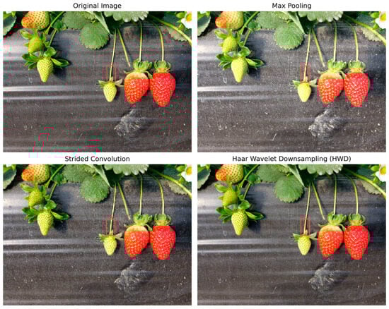 In this study, the target area is defined as the strawberry peduncle, which plays a critical role in detecting keypoints for harvesting. As the structural link between the fruit and the plant, the peduncle is the focal point for the robotic arm to accurately identify and perform picking actions. A comparison of downsampling methods—max pooling, strided convolution, and Haar wavelet downsampling (HWD)—reveals their impact on image processing performance, as illustrated in Figure 10. HWD excels in preserving the intricate details of strawberry peduncles, which are essential for precise feature extraction. This detailed preservation directly contributes to the accurate detection of keypoints necessary for robotic strawberry harvesting. In contrast, while max pooling effectively retains prominent features, it sacrifices finer details, which can hinder the identification of keypoints in texture-rich regions. Strided convolution strikes a balance between feature extraction and parameter reduction but struggles to retain high-frequency details, limiting its performance in detecting delicate structures like peduncles. By preserving both high- and low-frequency information, HWD ensures superior resolution sensitivity and a more detailed image representation. The ability to maintain peduncle details significantly improves keypoint detection accuracy, which is crucial for the successful operation of robotic harvesting systems in agricultural settings.