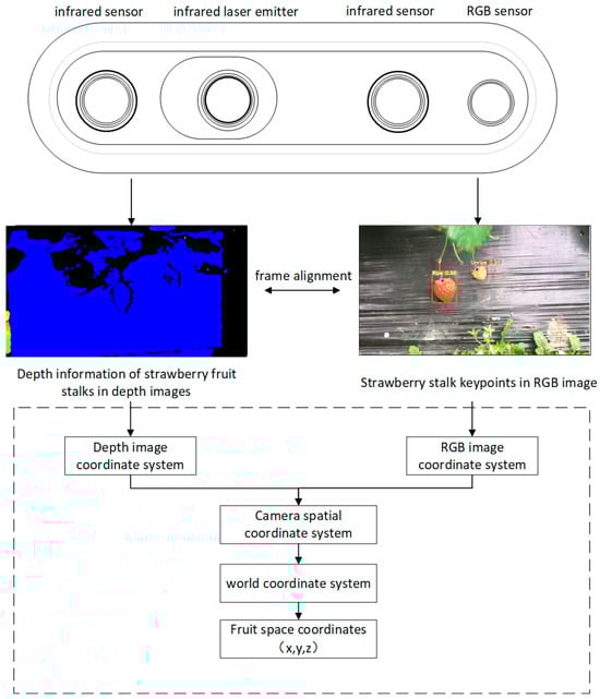 This study employs the D435i [37] infrared stereo camera to obtain the three-dimensional spatial coordinates of the target fruit. As shown in Figure 11, the specific process is as follows: First, RGB and depth images are synchronously captured using the D435i camera. By leveraging the collaboration between the depth sensor and the RGB sensor, spatial alignment is ensured, thus guaranteeing consistency between the depth information and the detection results of strawberry keypoints in the RGB images. Next, the model uses a keypoint detection algorithm to extract the two-dimensional keypoint positions of the strawberry fruit from the RGB images. These two-dimensional coordinates are then matched with the corresponding depth information from the depth images to accurately calculate their positions in three-dimensional space [38]. Subsequently, the system analyzes the depth image to determine the three-dimensional coordinates (x, y, z) of the strawberry harvesting keypoints in the camera’s coordinate system. Further, through coordinate transformation, the three-dimensional position in the camera coordinate system is mapped to the world coordinate system, obtaining the precise location of the target fruit in the real-world environment. The spatial coordinates calculated from this process provide the basis for the subsequent robot harvesting path planning and execution, allowing the robot to approach the target fruit with precision and complete the harvesting task under various environmental conditions, such as occlusions and uneven lighting.
