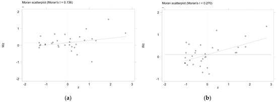 When determining whether to use spatial econometric methods, the first step is to examine whether the data exhibit “spatial autocorrelation”. Spatial autocorrelation refers to the similarity of variable values in geographically proximate regions. If high values cluster together and low values cluster together, it indicates positive spatial autocorrelation. Conversely, if high values are adjacent to low values, it indicates negative spatial autocorrelation. The Moran’s Index (Moran’s I) is commonly used for this analysis. The global Moran’s I is employed to identify spatial autocorrelation across regions, answering questions such as, “Is there a spatial relationship among variables?” and “Is it appropriate to use a spatial econometric model?” Meanwhile, the local Moran’s I further examines the specific types of spatial relationships present. By plotting a Moran scatter plot, the relationship between the observations of each region and its surrounding regions (i.e., neighboring regions) can be visualized. This allows for the verification of the applicability of spatial econometric models based on the distribution of observed values for different variables.
