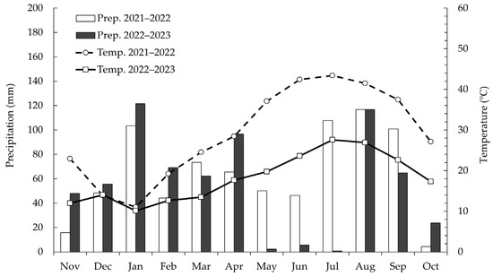Average monthly air temperature ranged from 11 to 43 °C and 10 to 28 °C in the 2021–2022 and 2022–2023 seasons, with the lowest and highest observed in January and July in both seasons, respectively (Figure 1). The temperature in the 2021–2022 season was always higher than the 2022–2023 season after January. Total precipitation was 779 and 667 mm in the two whole seasons, respectively, during which the precipitation in the 2021–2022 season (ranging from 50 to 108 mm) was higher than the following season from May to July (ranging from 1 to 6 mm) and in September, covering most periods of the cotton growth (Figure 1).