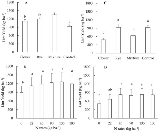 Figure 2. Responses of cotton lint yields to cover crop integration (top panels) (A,C) and N fertilization (bottom panels) (B,D) in 2022 (left panels) (A,B) and 2023 (right panels) (C,D). Since no significant interaction effect was observed in both seasons, data were presented as averages across each treatment. Bars indicate the standard errors of the means across either cover crop (n = 16) or N fertilization (n = 24) treatment. Different letters indicate significant differences at each treatment level (p < 0.05).