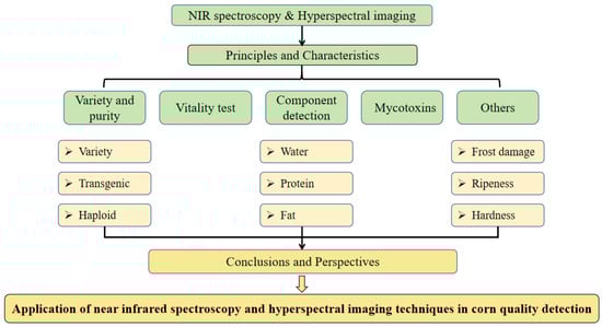 Existing non-destructive corn quality detection technologies [5] include electronic nose and electronic tongue detection methods based on chemical properties, dielectric property detection methods based on electrical properties, spectral technology based on optical properties, etc. Since optical property detection technologies have high detection speed and accuracy, some research based on near-infrared spectroscopy (NIRS) and hyperspectral imaging (HSI) have been reported before, according to the characteristics of non-destructive and rapid spectral imaging technology, as well as the wide application in agriculture and food detection. Therefore, to help readers to understand the field of corn quality detection, this study collated and summarized the literature of NIRS and HSI technology in nondestructive testing of corn quality. In this review, the principles of these two technologies (NIRS and HSI) were first introduced, and the difference between them were compared. Then, the development and application of different indicators such as corn variety and purity, vitality, internal composition, mycotoxins infection, and other indicators are introduced. Finally, the challenges and future research directions in corn quality detection are discussed. The schematic diagram of this study is shown in Figure 1.