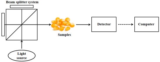 Near-infrared spectroscopy (NIRS) ranges from 780 to 2500 nm and is divided into short-wave near-infrared (wavelength: 780 to 1100 nm) and long-wave near-infrared (wavelength: 1100 to 2500 nm) [6]. It records the overtones and their combinations. of hydrogen-containing groups X-H (C-H, O-H, N-H, etc.) and covers a large amount of structure and composition information, so the components containing these groups can be established by chemometrics with relational models for qualitative or quantitative analysis of samples [4]. The NIRS equipment is relatively simple. The common components include a light source, a beam splitter system, a sample stage, an optical detector, and its data analysis system (Figure 2).