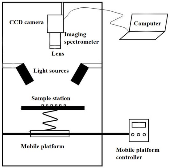 Compared with NIRS equipment, the structure of hyperspectral equipment is more complex. It mainly includes a CCD camera, imaging spectrometer, lens, light source controller, sample station, mobile platform and its controller, hyperspectral data acquisition software, and mobile platform of mobile control software (Figure 3). The imaging spectrometer is the core component, which is able to obtain both spectral and spatial information of the target. Optical systems need to have higher resolution to ensure the quality of spectra and images. Its detectors usually need to have high sensitivity and high resolution to cope with a large number of spectral bands and fine image information [7] in size and higher in price, and the detectors are often used in aerospace remote sensing and large-scale farmland monitoring in precision agriculture and other fields. The application of hyperspectral imaging technology can not only locate the specific position of the sample, obtain the spectral information of the specific position, and detect the chemical composition of the sample, which is a fast and efficient optical detection means. According to different scanning methods, it can also be divided into point scanning, line scanning, and area scanning, among which line scanning is most commonly used. Table 2 shows the comparison of these technologies.