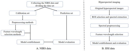 As for the processing of NIRS and HSI data, the general analyzing steps are shown in Figure 4. In the processing of NIRS data [6], the general steps (Figure 4A) are divided into sample collection, spectral data preprocessing, feature waveband selection, model establishment and evaluation, etc. At the same time, from the principle of HSI technology, it can be seen that its processing methods include spectral data processing and image data processing (Figure 4B). In general, image data processing and analysis are first carried out, including image preprocessing, image segmentation, feature extraction, etc., and the spectral data processing methods and steps are the same as NIRS data.