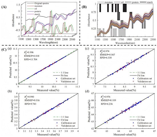 (A) Spectroscopic data of the samples (the average values of the original spectra and the pretreated and normalized moisture, grease, protein, and starch spectra of the sample), (B) characteristic spectral intervals selected by BiPLS, and (C) distribution map of measured and predicted values, (a–d) predicted results of moisture, oil, protein, and starch, respectively [80].