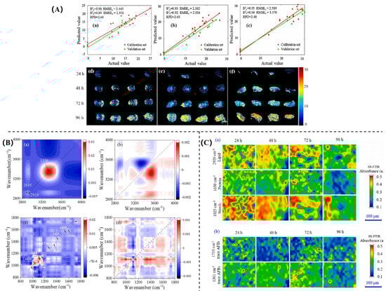 (A) Linear regression plots and pixel–level visualization maps of multispectral models predicted AFB1 levels with the gradual damage on intact (a,d), pierced (b,e) and halved (c,f) samples inoculated by A. flavus over time course. (B) the synchronous (a,c) and asynchronous (b,d) 2DCOS maps generated from the SR-FTIR spectra of inoculated halved samples. (C) SR-FTIR images for chemical distributions of nutrient depletion (a) and trace AFB1 accumulation (b) at significant wavenumbers from the thin section of inoculated halved kernels over inoculated time of 24–96 h [106].