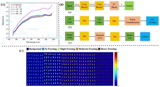 (A) The average spectra of corn seeds at different freezing conditions, (B) the DCNN structure, where (a) is the DCNN structure, (b) is the Convs block, (c) is the FC block, and (C) visualization map of the seeds with DCNN model [112].