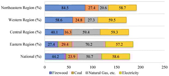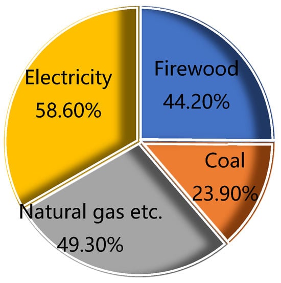Despite the remarkable progress in energy technologies and infrastructure development, the level of clean energy utilization in rural areas remains relatively low. Data from 2016 indicate that 49.30% of rural households primarily used gas for cooking and heating, while 58.60% relied on electricity (Figure 1). However, energy poverty is particularly acute in western and northeastern China. In these regions, limited economic development, insufficient energy infrastructure coverage, and high costs of clean energy access pose significant challenges. For example, in northeastern rural areas with substantial heating demands, households often opt for traditional fuels such as firewood and coal due to their lower costs and ease of access. Although clean energy sources such as natural gas and electric heating are gradually being introduced, their high initial installation and operational costs create financial barriers for many rural households. Consequently, over 80.00% of households in these areas continue to rely on firewood and coal as their primary energy sources (Figure 2). This energy structure not only limits improvements in rural living standards but also hinders regional sustainable development.