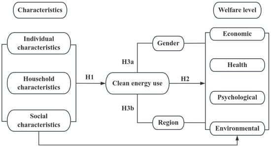 The welfare effects of clean energy are multifaceted, demonstrating positive impacts across economic, health, psychological, and environmental domains. First, the use of clean energy helps to reduce environmental pollution from traditional energy sources, improves air quality, and enhances residents’ living environments, thereby promoting health and social welfare [20]. Second, the adoption of clean energy can shorten cooking times and alleviate the labor intensity associated with fuel collection for women and children, freeing up labor resources and improving production efficiency, which in turn increases household economic welfare [24]. Furthermore, clean energy is often associated with modernization and progress; its use can provide individuals with psychological satisfaction. Particularly when clean energy is perceived as a social trend or a marker of advancement, individual participation may foster a sense of psychological value recognition and social belonging, thereby enhancing life satisfaction and well-being [35]. Overall, the impact of clean energy usage on the multidimensional welfare of residents is positive. Based on this, this study proposes the following hypothesis: