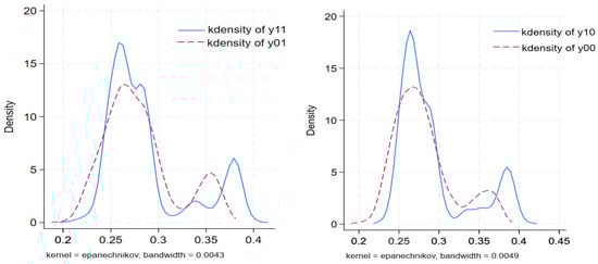 To visually illustrate the welfare effects of clean energy use, we combined the probability density distribution of the comprehensive welfare levels of rural residents using and not using clean energy (see Figure 4). The left panel displays the ATT results, indicating that in the “counterfactual” scenario, if clean energy users chose not to use it, their probability density curve for comprehensive welfare levels shifts significantly to the left, reflecting that not using clean energy would lead to a substantial reduction in welfare levels, with an ATT value of 0.0063. The right panel shows the ATU results, indicating that for residents not using clean energy, the probability density curve for comprehensive welfare levels shifts markedly to the right in the hypothetical “counterfactual” scenario where they choose to use clean energy, yielding an ATU value of 0.0089. This reinforces the validity of Hypothesis H2, suggesting that non-users who choose to use clean energy would experience a significant improvement in their welfare levels.