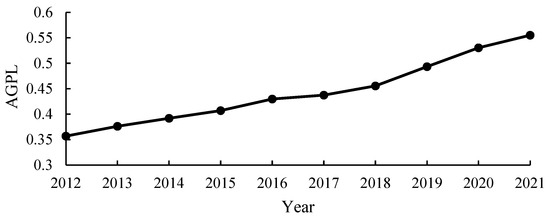 Figure 2 illustrates that the AGPL in the MGPAs had consistently risen from 0.357 in 2012 to 0.555 in 2021, with an annual growth rate of 2.13%. Particularly noteworthy is the substantial improvement observed from 2012 to 2016, which was largely attributed to the significant support provided by the government to enterprises engaged in agricultural green production [14]. By 2015, the total count of green agricultural production enterprises in China had surpassed 6000. Meanwhile, the level of agricultural mechanization had reached 63%. However, from 2017 to 2018, the growth rate of the AGPL slowed down. This was primarily due to frequent natural disasters, such as floods in Hubei and Anhui provinces, which had a considerable effect on China’s total grain output. Between 2019 and 2021, there was a notable increase in the growth rate of AGPL. This increase is largely due to the recognition of green agricultural development as a national strategic priority, as outlined in the 19th National Congress of the Communist Party of China report [7].