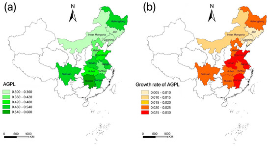 Inner Mongolia, Liaoning, and Jilin exhibited the lowest AGPL, with average values of only 0.311, 0.328, and 0.331, respectively. In these provinces, the utilization rate of cultivated land was low because of the inferior hydrothermal conditions in the northern areas, and the re-cultivation rate of arable land was less than 0.92.