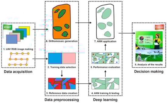 The methodology for weed detection, applied in this study, can be divided into eight steps (Figure 2).
