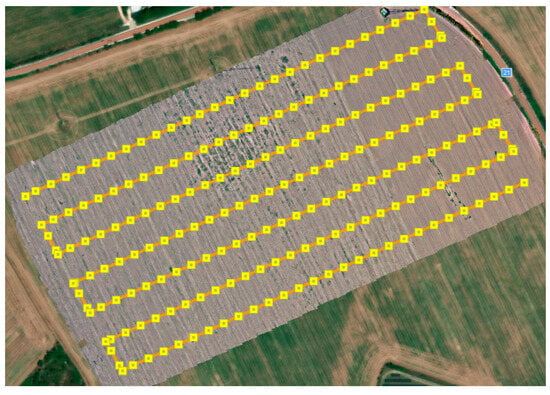 The generated orthomosaic of the investigated field, the camera locations (yellow squares), and the flight path (orange line).