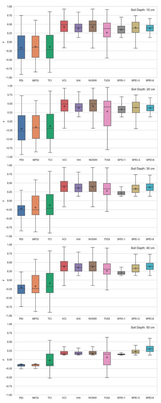 Boxplots for overall performance of different drought indices on capturing soil moisture at soil depths of 10–50 cm.