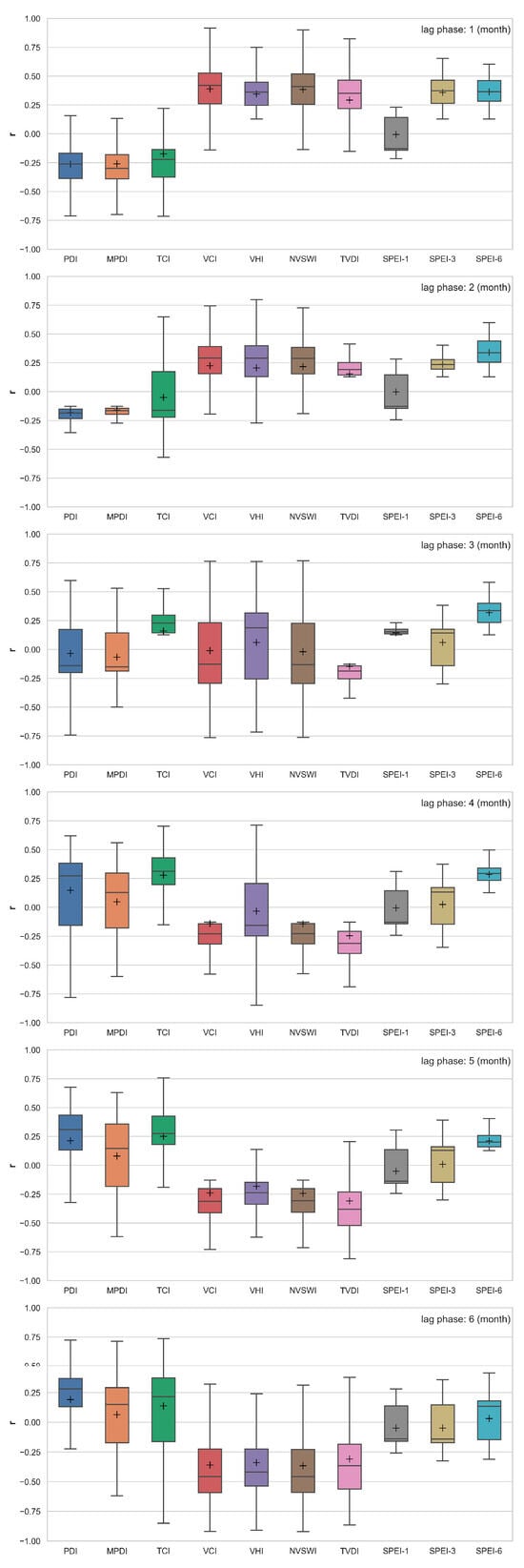 We investigated the performance of different drought indices in monitoring soil moisture at different soil depths at lag periods of 1, 2, 3, 4, 5, and 6 months. Taking a soil depth of 10 cm as an example (Figure 8), we found that PDI, MPDI, TCI, and TVDI showed better performance in monitoring soil moisture at different lag phases after considering the time lag effect. Overall, PDI and MPDI showed the best performance in monitoring soil moisture at 10 cm soil depth at a lag of 1 month compared to no lag effect, TCI showed normal overall performance in monitoring soil moisture at a lag of 3–6 months, and the best overall performance at a lag of 4 months, while TVDI showed normal overall performance in monitoring soil moisture at a lag of 3–6 months, and the best overall performance at a lag of 5 months. Our findings confirm that the reasons for the poor performance of PDI, MPDI, TCI, and TVDI are related to the time lag effect [].
