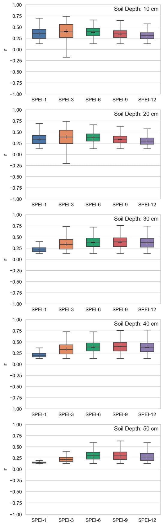 As can be seen in Figure 7, among SPEI-1, SPEI-3, and SPEI-6, SPEI-3 was the best performing index for monitoring soil moisture at soil depths of 10 cm and 20 cm, and SPEI-6 was the best index for monitoring soil moisture at 30–50 cm. It seems that drought indices on longer timescales show better performance with deeper soil depth. However, whether longer timescales SPEI indices have better performance in monitoring soil moisture (especially at deep soil depths) still needs to be discussed. Therefore, we also assessed the characteristics of the cumulative effect of drought quantified by SPEIs at 9- and 12-months scales in monitoring soil moisture. From Figure 9, SPEIs does have the cumulative effect in monitoring soil moisture, but it is not necessary to infinitely extend the cumulative time to achieve optimal monitoring performance with the deepening of soil depth. At 10 cm and 20 cm, the best SPEI performance was achieved with a cumulative time of 3 months, and at 30–50 cm, the SPEI indices with cumulative times of 6 and 9 months performed very similarly, both better than the performance of the 1-month and 12-month timescales. The findings of this study confirms that the formation of agricultural drought measured by soil moisture deficit takes at least three months []. Commonly, 3- to 6-month timescale SPEIs are used as indicators of agricultural drought [].