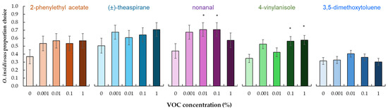 3.3. Behavioral Response of O. insidiosus to VOCs Found in the Interaction Between Rose Flowers and WFT