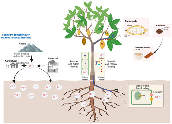 As a cauliflorous tree—flowers and pods develop on the trunk and thicker branches of the plant—cacao has unique mechanisms for loading Cd into developing seeds. Cadmium translocation involves direct xylem transport and source-to-sink remobilization via the phloem [65], with this mobility varying according to plant species and age. Initially, it was suggested that a significant portion of Cd taken up by cacao bypassed the leaves, traveling directly from roots and branches to beans, suggesting the branches as relevant Cd storage [54,55,65]. However, isotope tracing studies confirmed that Cd can reach beans via phloem tissues in the branches. More recent research using hydraulic pulse monitoring indicated that most Cd in beans originates from leaf redistribution, particularly during the final stages of bean development, highlighting the mobility of Cd in phloem tissues [55,69].
