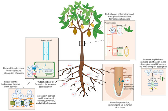 Cadmium uptake by cacao plants does not solely depend on total soil Cd concentrations. Even soils with low Cd levels can lead to significant uptake by cacao [56]. Consequently, total soil Cd is not a reliable predictor of Cd availability for crops. Instead, soil pH emerges as the primary factor influencing Cd uptake, followed by soil Cd bioavailability, genotype, geographical location, phosphate fertilizers, and interactions with minerals such as Zn and Mn [29].