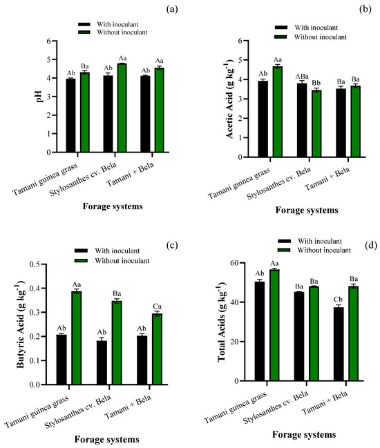 Interaction of forage systems and ensiling methods (with and without inoculant) for pH, acetic acid, butyric acid, and total acids of the different silages. Same uppercase letters, in the black columns (inoculant treatment), do not differ from each other by the Tukey test (p < 0.05). Same uppercase letters, in the green columns (no inoculant treatment), also do not differ from each other by the Tukey test (p < 0.05). Furthermore, same lowercase letters, within each forage system (Tamani guinea grass, Stylosanthes cv. Bela or Tamani + Bela), do not differ from each other by the Tukey test (p < 0.05).